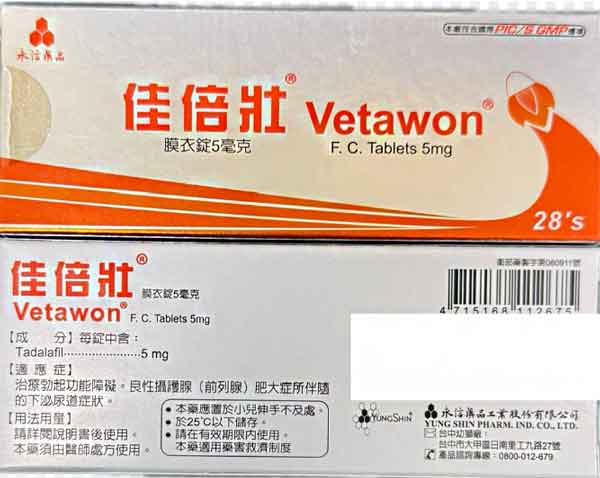 佳倍壯(Vetawon 5mg)是國內核准的 Tadalafil 學名藥,與大家熟知的犀利士相同成分,屬於每日服用的低劑量配方。它的特色是: