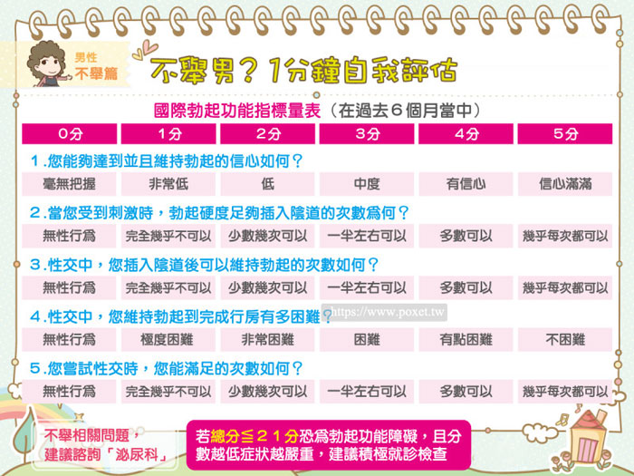 若自評發現得分低於21分時,建議最好就診檢查喔。這項自評僅為初步的評估參考,並非確診的唯一標準,但可以確認的是,分數越低、勃起障礙的可能性就越大;若上述5題得分加總小於或等於21分時,建議諮詢醫師進一步的診斷方能確診。