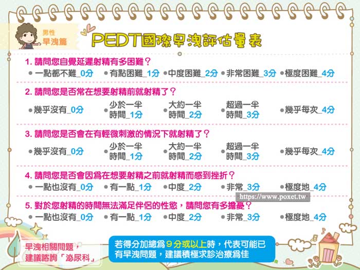 再填寫完這五個問題之後把分數加總。如果分數介於0~8分之間都是正常的,但是如果分數超過9分但是低於11分就可能有早洩的問題,一但分數超過11分表示已經有早洩的困擾囉